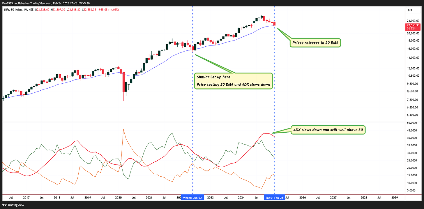 One of the fundamental principles of the Squeeze Setup is that once an asset deviates significantly from its 20 EMA, it tends to revert back to this level, which acts as a dynamic support. Currently, the monthly 20 EMA is placed around 22,400, making it a strong candidate for a potential support level.