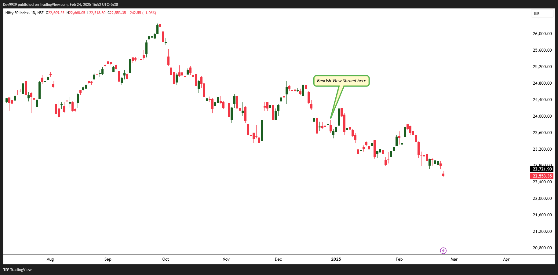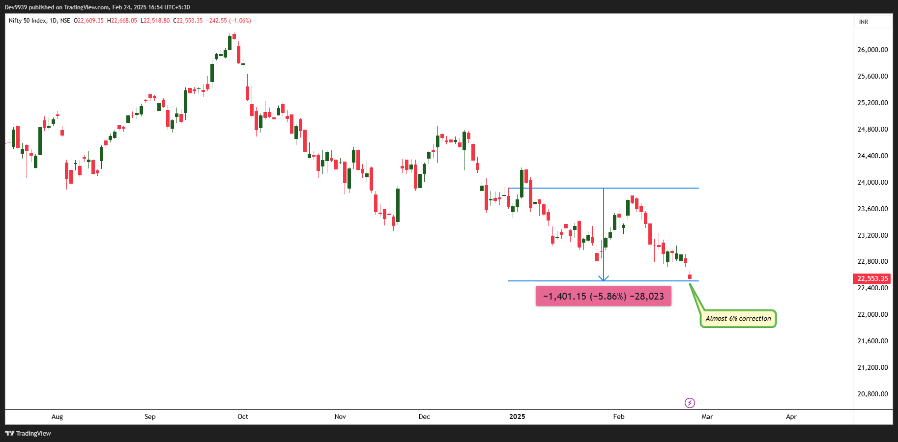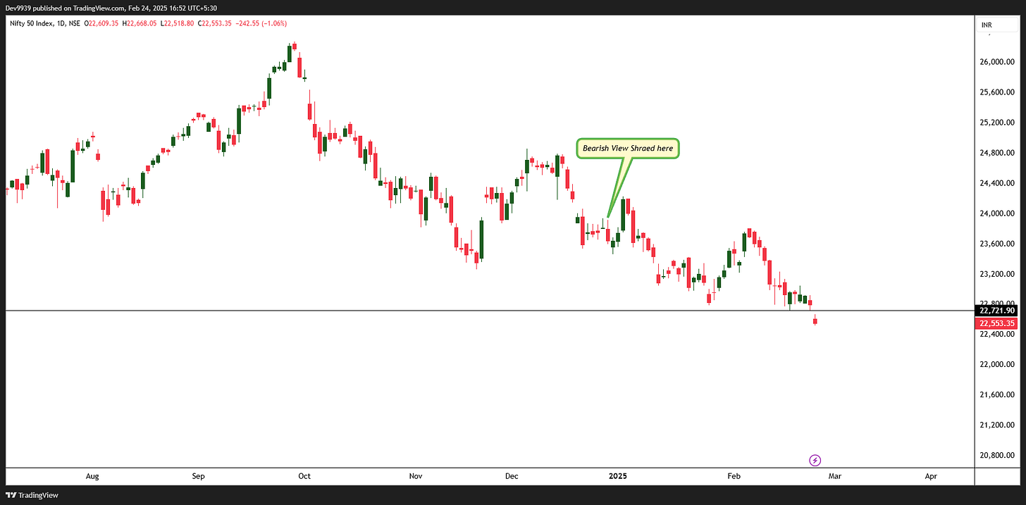 In my previous article, we had clearly outlined that the Nifty index was exhibiting weakness, supported by both Traditional Technical Analysis and Elliott Wave perspectives. Since then, the index has experienced a sharp decline of over 1400 points. See the images below.