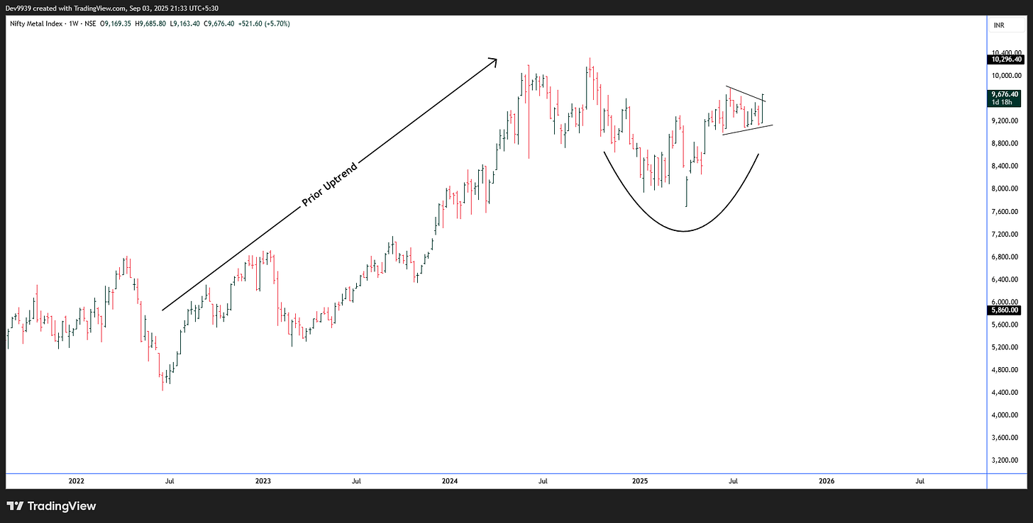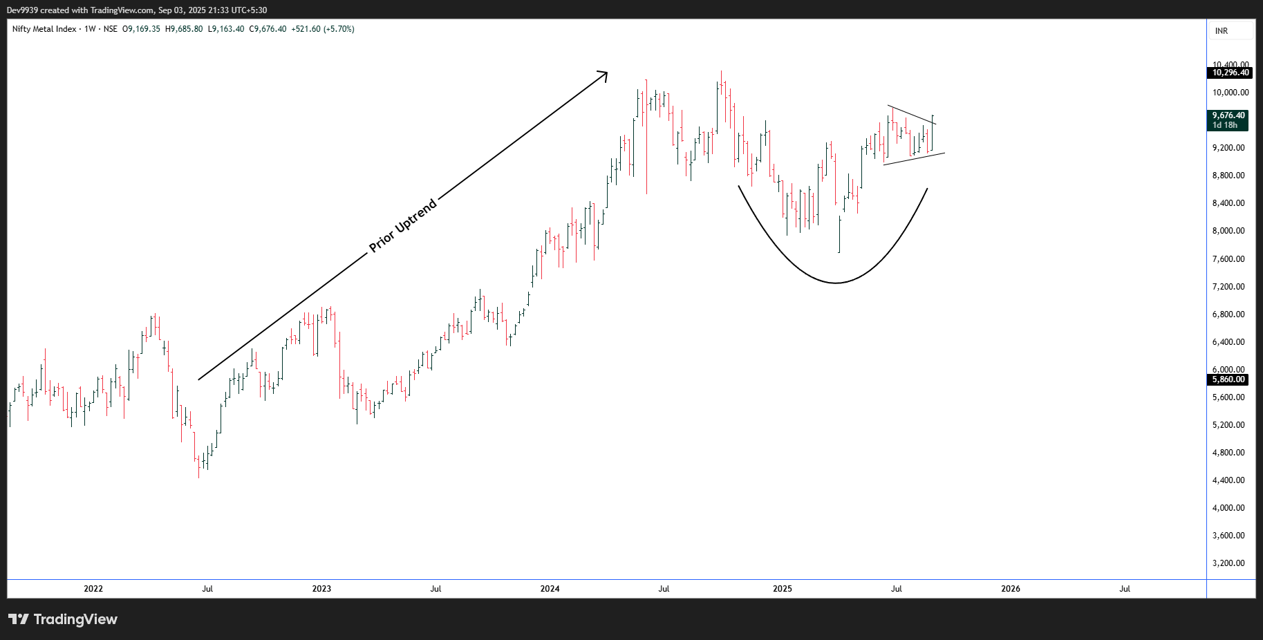 The Nifty Metal Index, after an explosive rally to all-time highs near 10,322, faced a sharp correction—shedding nearly 27% from the top. This correction, though steep, was hardly a collapse; it’s been part of a healthy market cycle, shaking out the excess and setting the stage for a new structural base.