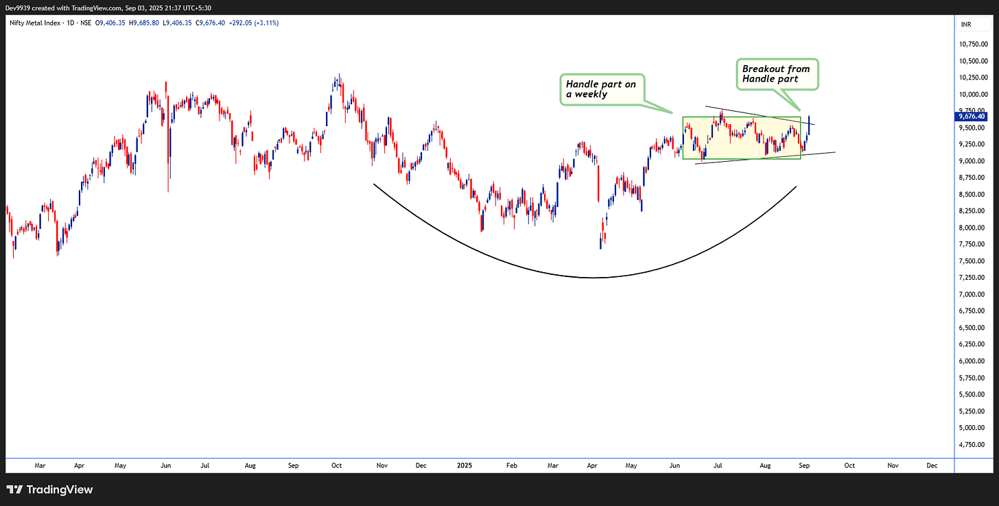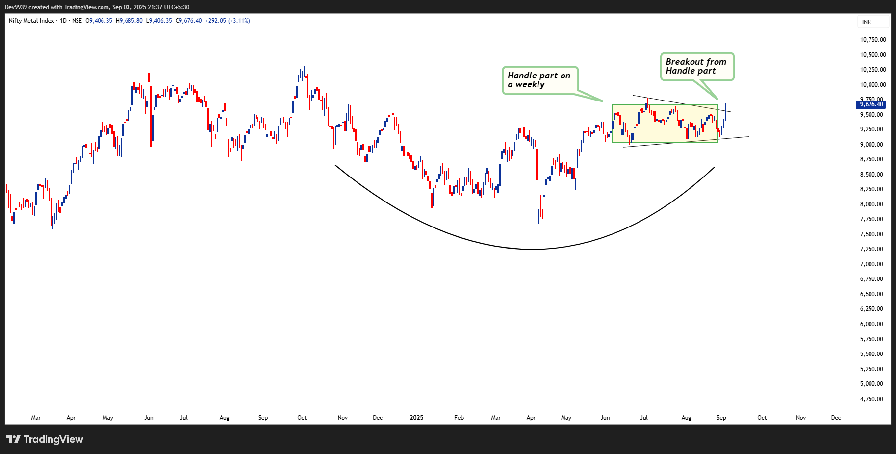 The Nifty Metal Index’s Cup & Handle breakout is a rare and powerful structural event. With sector fundamentals improving and price action confirming bullish intent, metals may be set for a renewed shine. Those who recognize and act on these early signals may be rewarded ahead of the crowd.